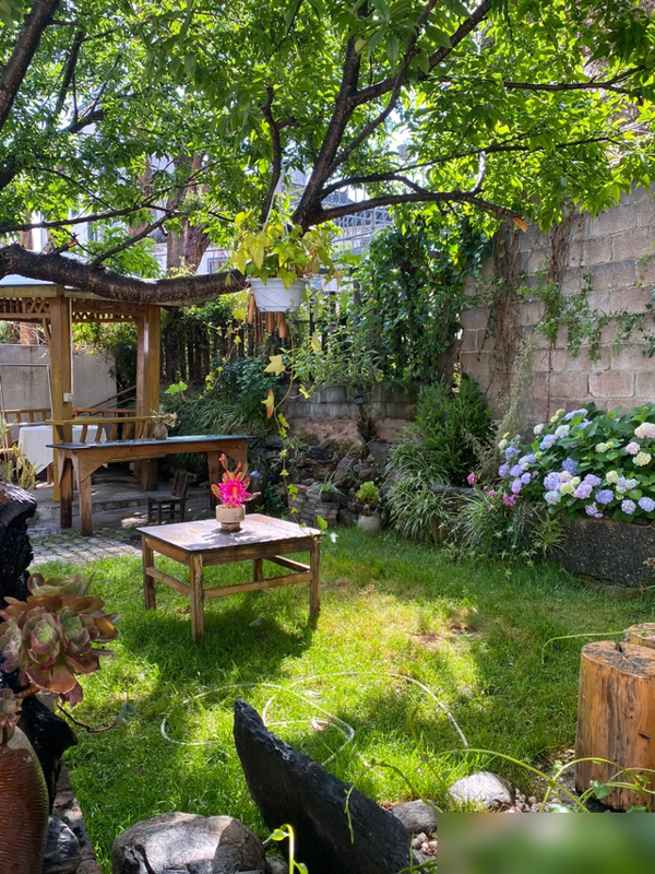 夏天傍晚坐那儿喝茶,风一吹花香扑鼻,脚边落几片叶子也懒得扫——这才是过日子。